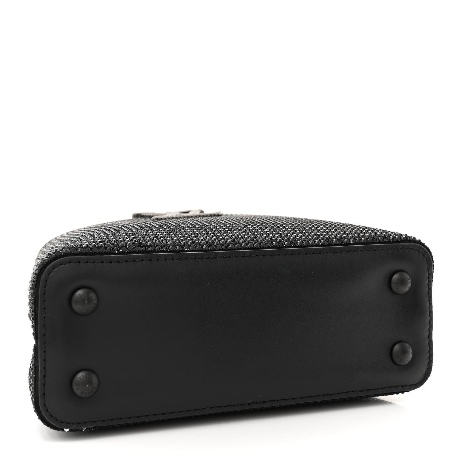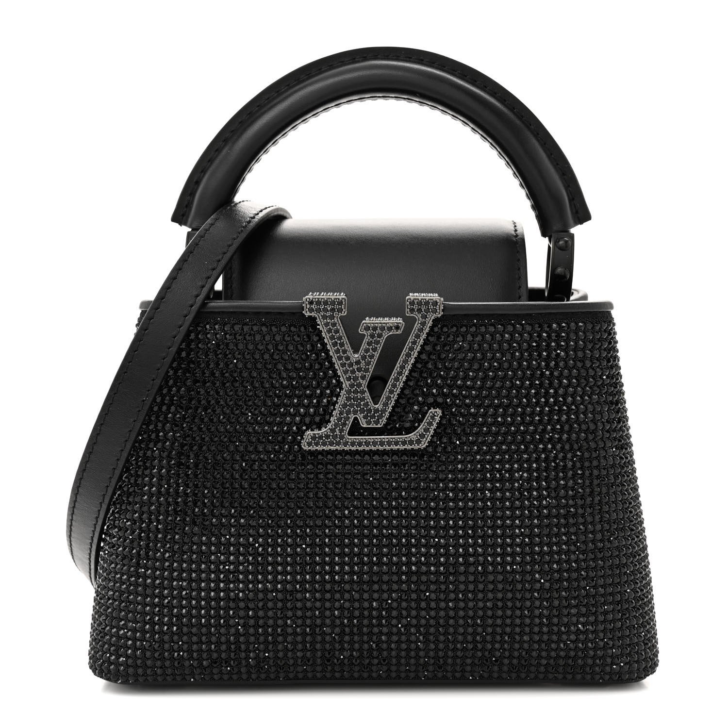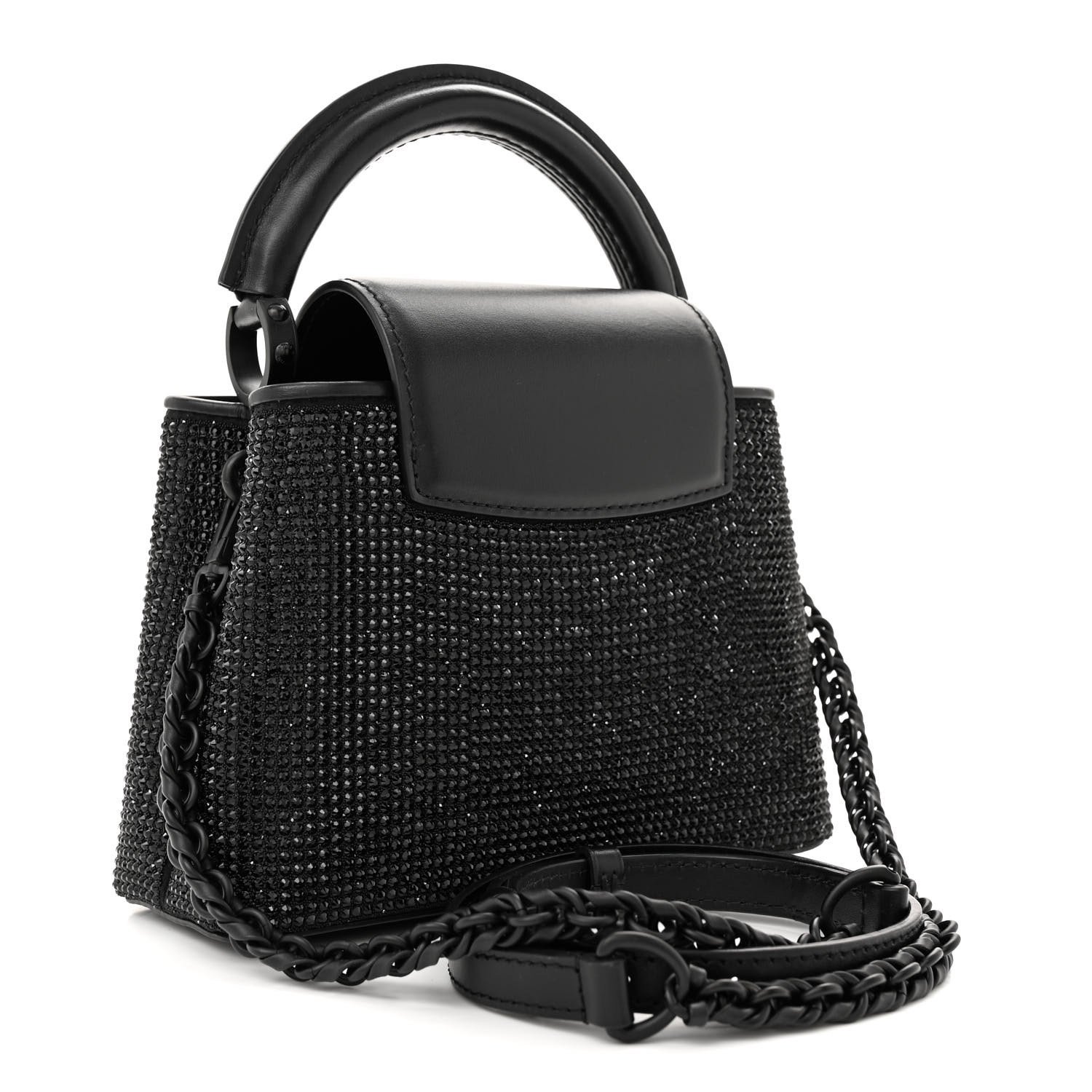 This is an authentic LOUIS VUITTON Swarovski Calfskin Capucines Mini in Black. This beautiful bag is crafted of black calfskin leather covered in Swarovski crystal beads. This handbag features a leather top handle, an optional matte black chain and leather shoulder strap, a flap closure, and matte black hardware. The top opens to a matching black leather interior with a flat pocket.